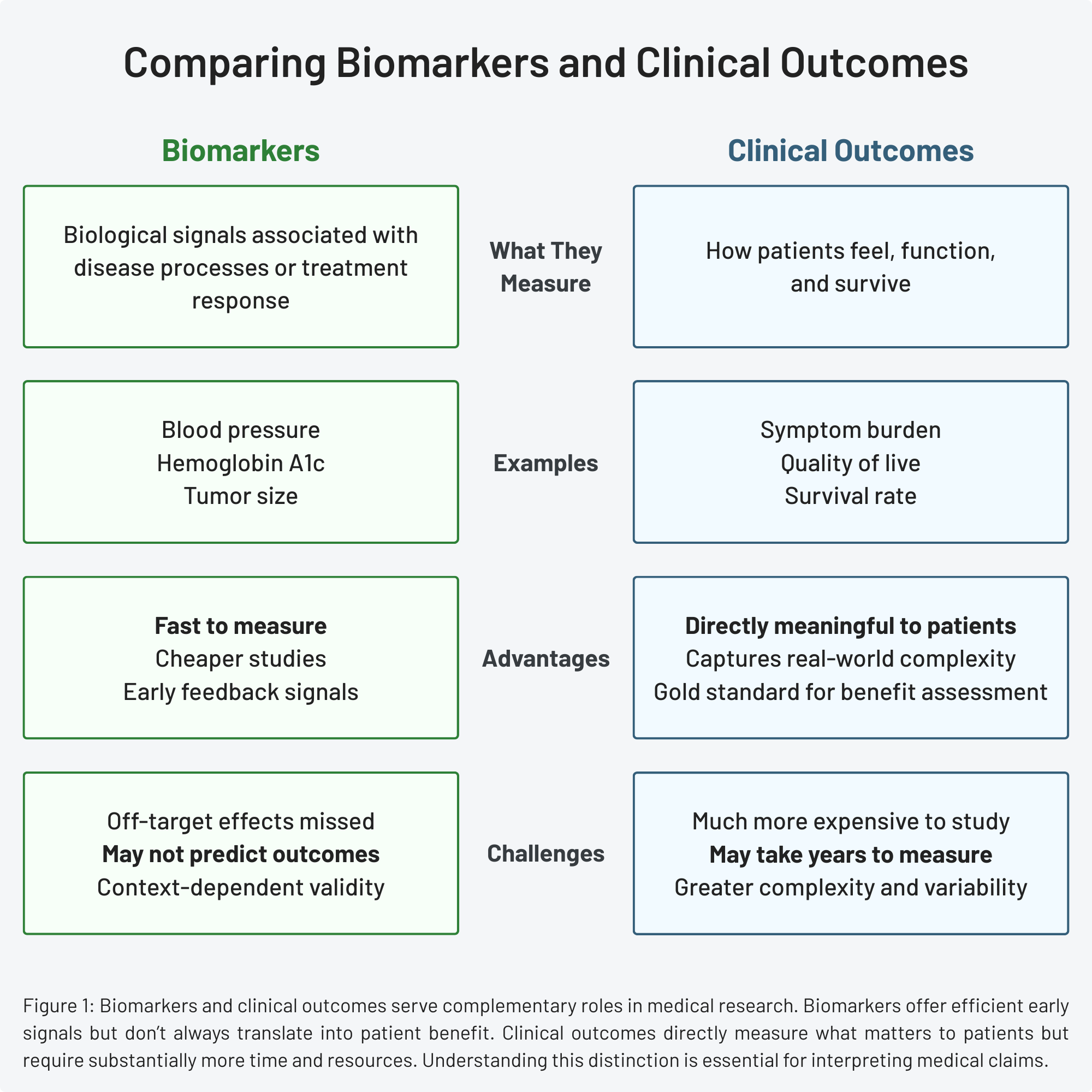 Biomarkers are distinct from measures of how a person feels, functions, or survives—a category known as clinical outcome assessments. Clinical outcomes include symptom burden, quality of life, disease progression, functional capacity, and survival. These outcomes directly matter to a patient and are therefore considered the gold standard for evaluating treatment benefit.