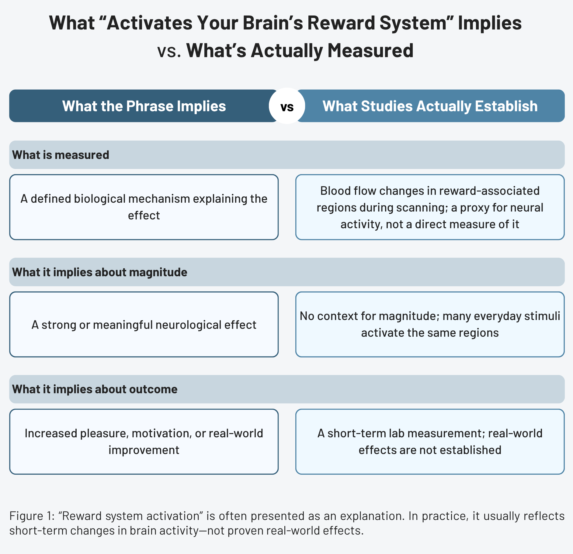 "Activates your brain's reward system" is only informative when it specifies what was measured, in whom, to what degree, under what conditions, and how it connects to an outcome that matters. When it functions as a standalone explanation, the phrase tells us much less than it appears to.