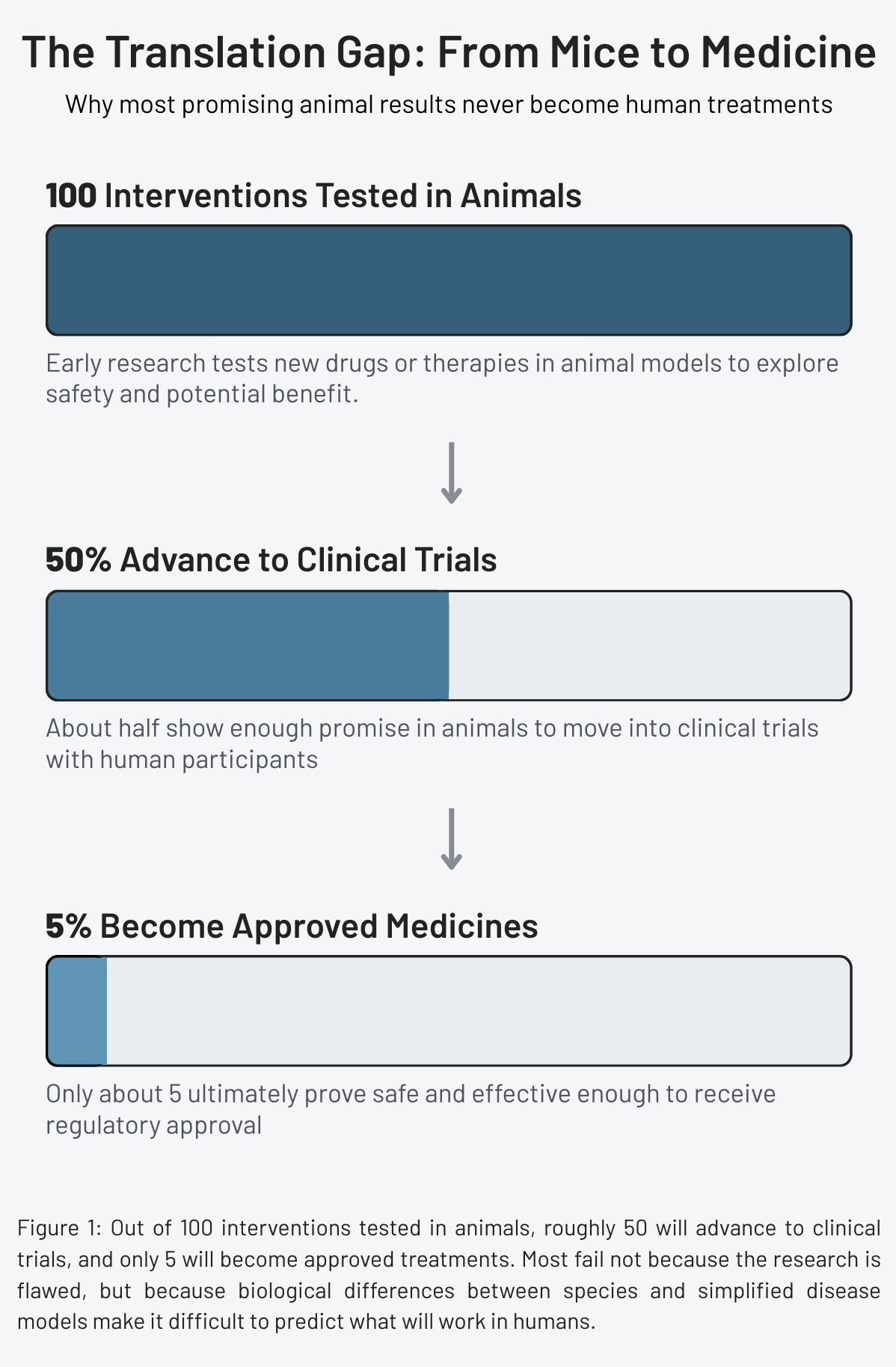 While mouse studies have contributed to many important advances, a large body of evidence suggests their predictive power is limited. A widely cited review found that about 50% of therapies progress from animal studies to human trials, but only 5% ultimately reach regulatory approval. In other words, most interventions that look promising in animals fail somewhere along the path to clinical use. Given this low translational rate, why are mouse models still so heavily relied on?