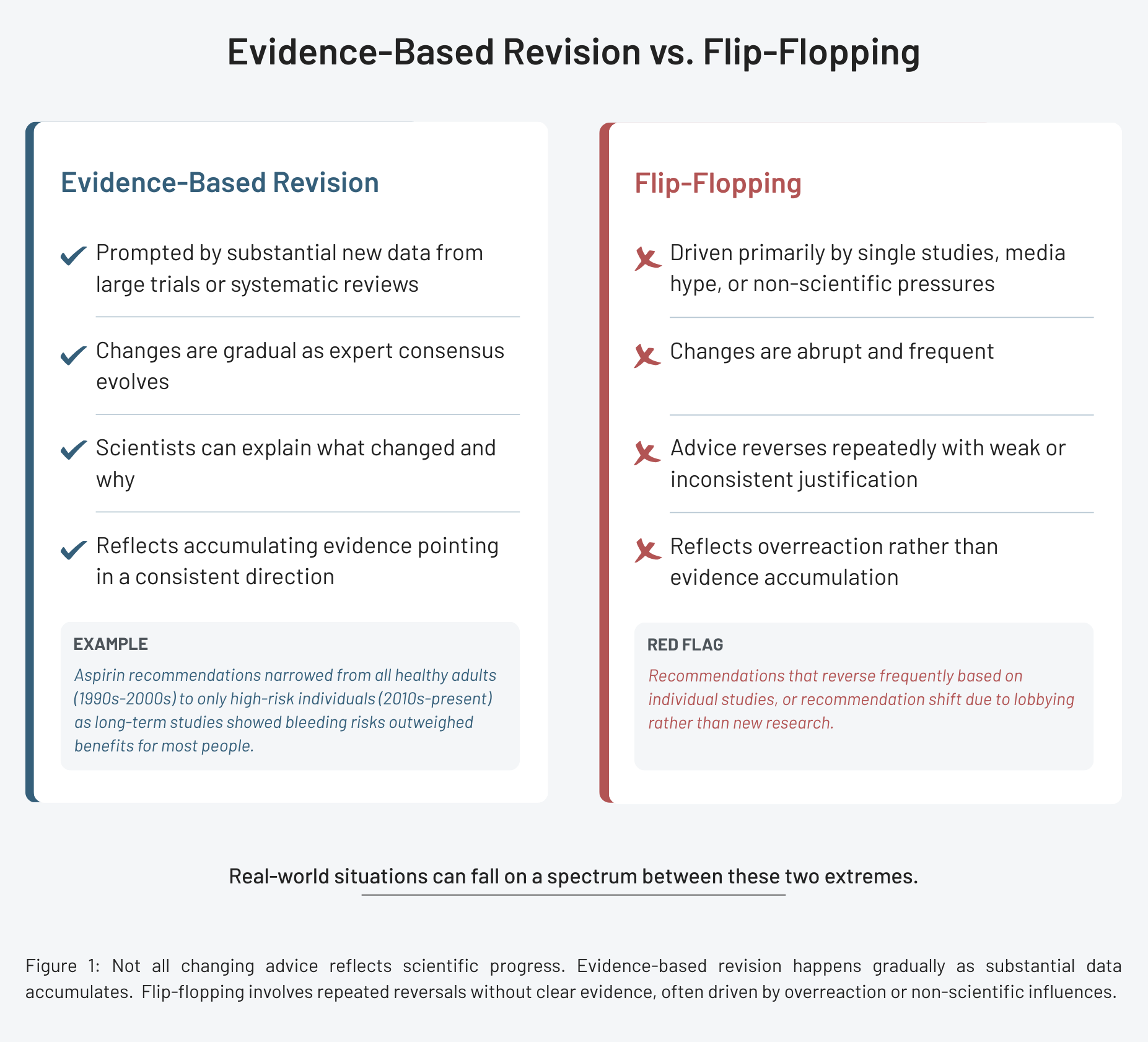 True flip-flopping looks different. It involves advice that keeps reversing without clear evidence justifying each reversal. It may reflect overreaction to single studies, media hype, or non-scientific influences such as financial conflicts or political incentives.