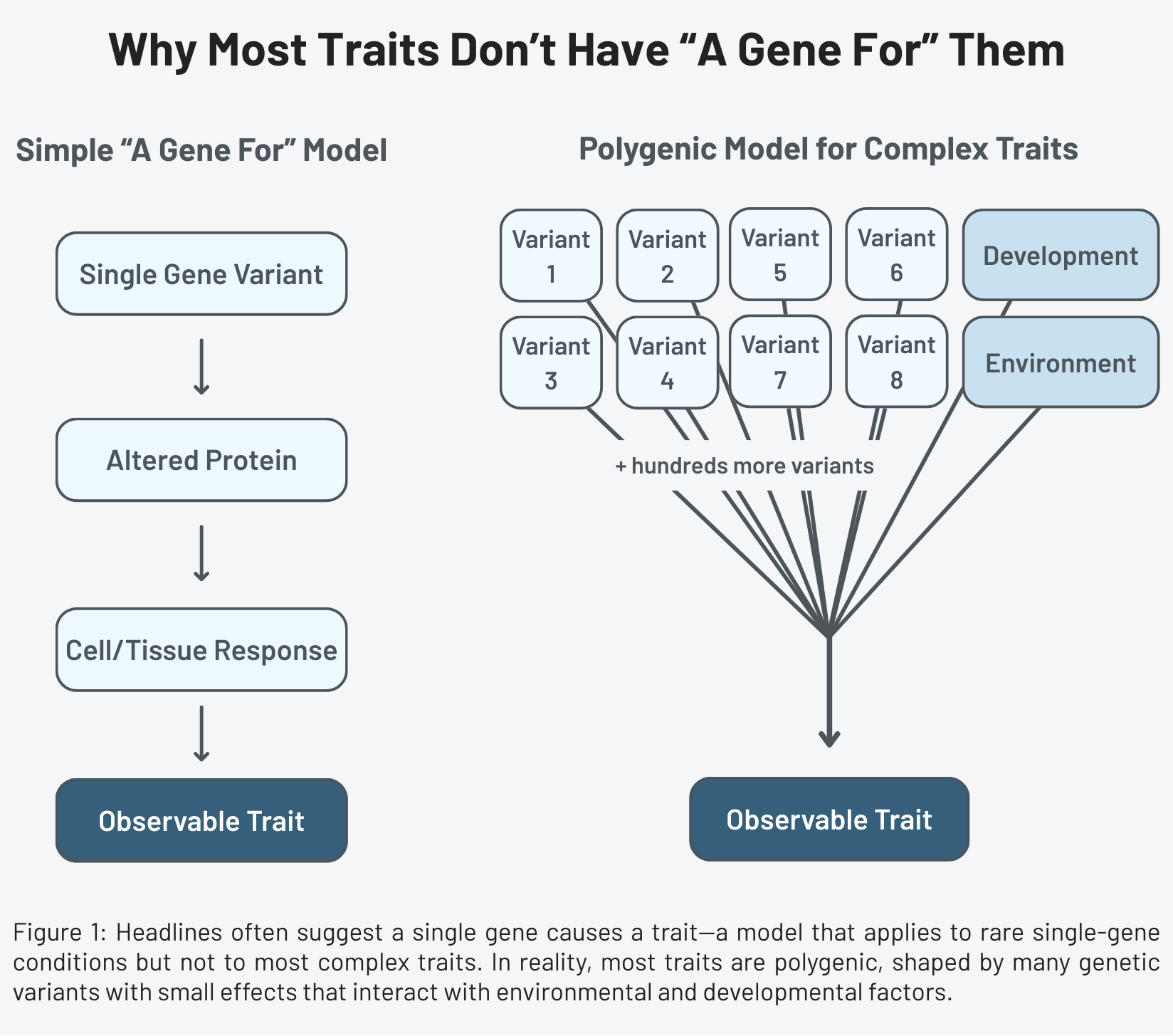 The more accurate picture is less tidy. Most human traits reflect the interaction of many genetic variants, environmental influences, developmental processes, and chance. They do not operate through a single switch.
